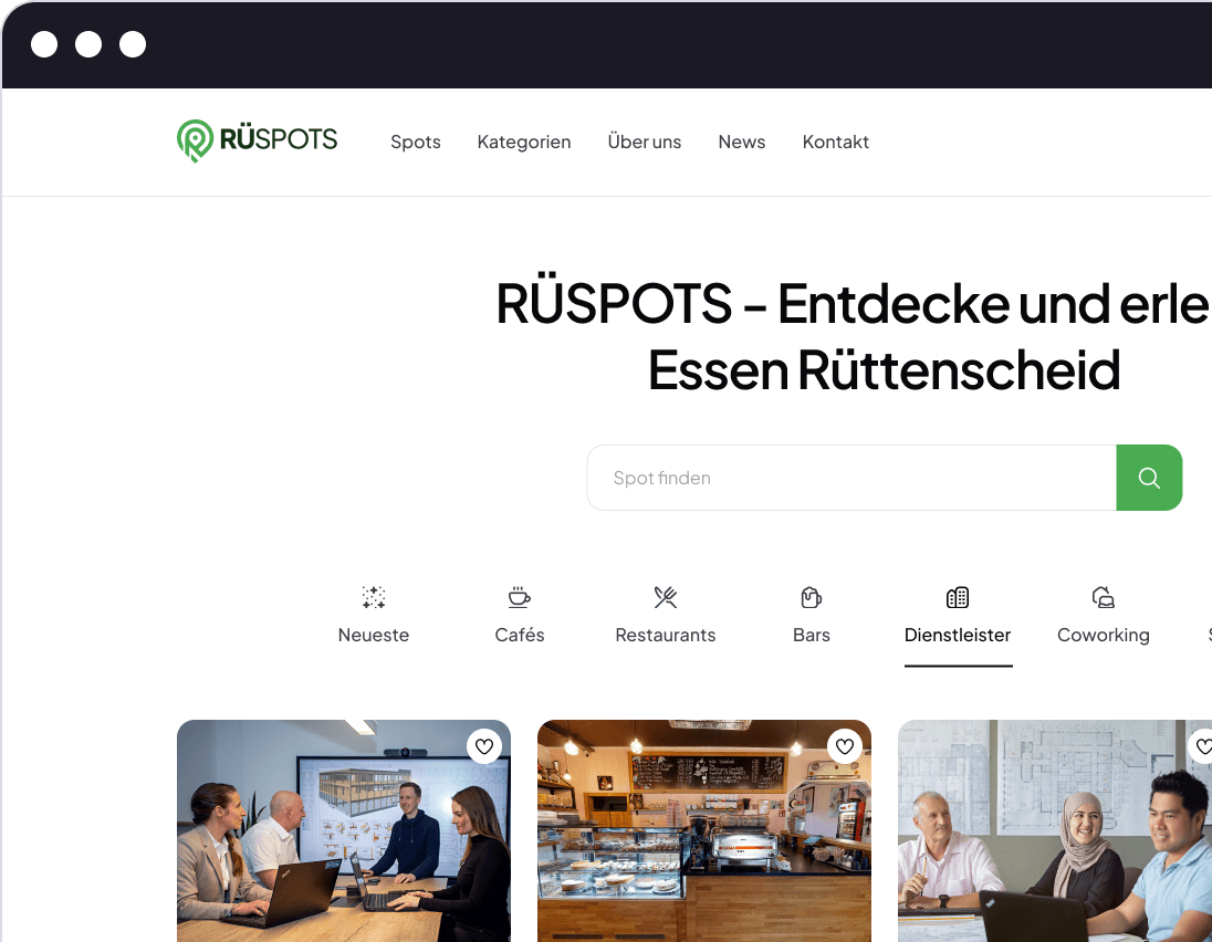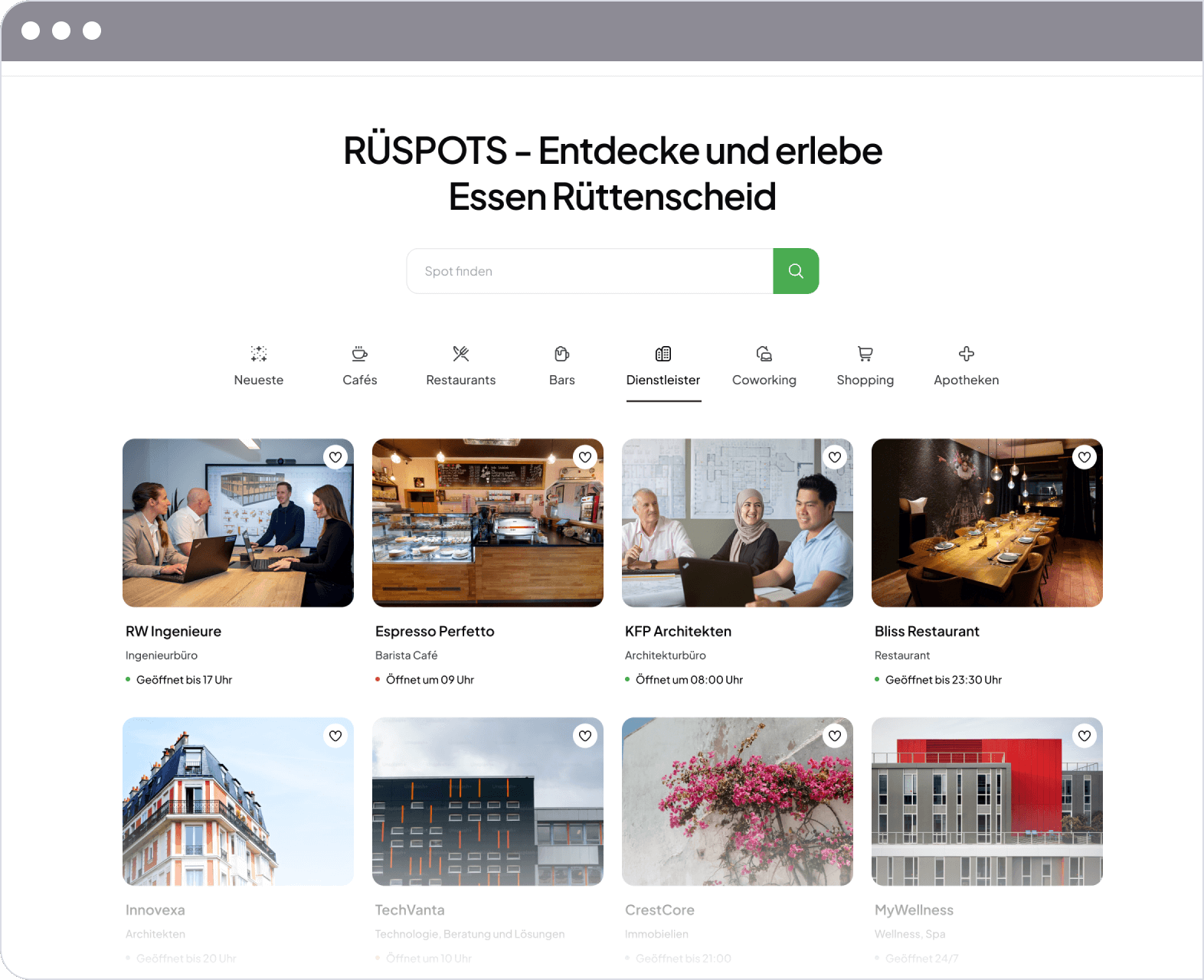 RÜSPOTS ist speziell auf Essen-Rüttenscheid zugeschnitten und bietet Dir die Möglichkeit, Dein Unternehmen innovativ und modern zu präsentieren. Außerdem profitierst Du von unserem umfangreichen Marketing und unserer engagierten Community.