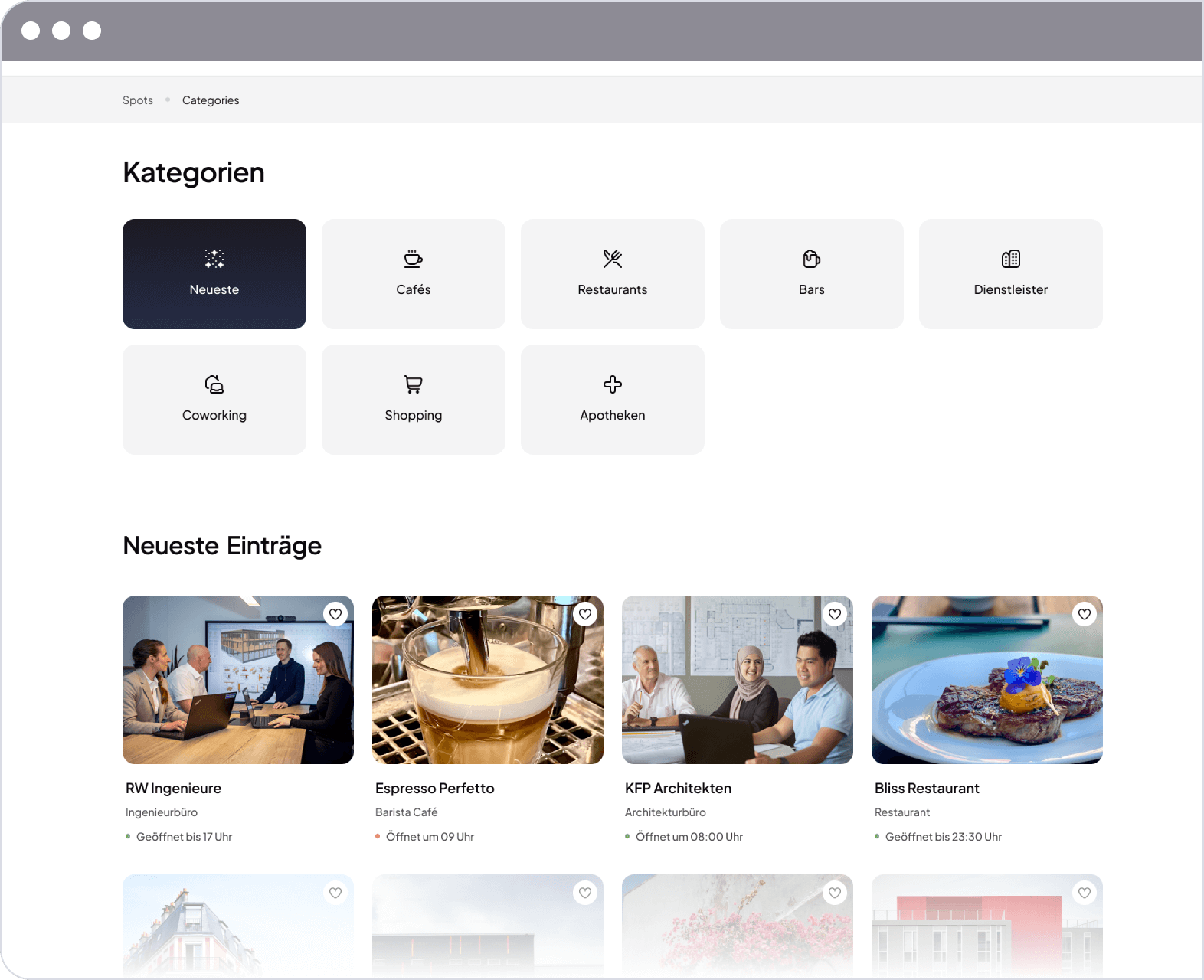 Unsere Plattform bietet Unternehmen, Gastronomen, Dienstleistern, Arztpraxen, lokalen Shops & Händlern eine einzigartige Möglichkeit, die Sichtbarkeit und Reichweite über die Grenzen Essens hinaus zu erhöhen und auf die eigenen Produkte und Dienstleistungen aufmerksam zu machen.